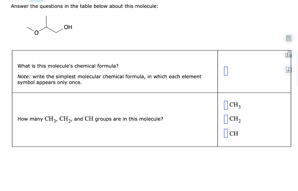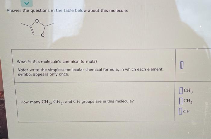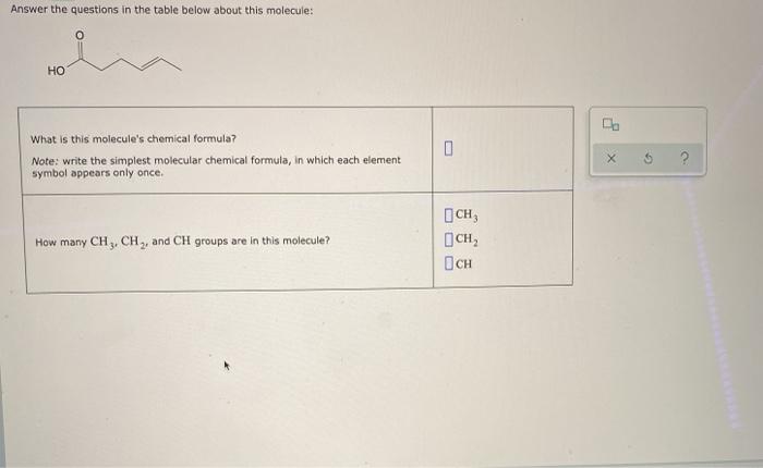 Identify The Functional Groups In The Following Molecules Use S From The Table Below Listeach Class Homeworklib from img.homeworklib.com Ch3 what is this molecule's chemical formula? Answer the questions in the table below about this molecule: What phrase best describes the arrangement of these electron groups. (if there is more than one angle, pick the smallest.) х 5 ? Base your answers to questions 64 through 65 on the information below. The correct answer is 'if molecules are small enough, then they can pass through the semipermeable membrane because they can cross the semipermeable membrane from their small pores or openings'. Answer the questions in the table below about this molecule: (you may need to use the scrollbar to see all the choices.) our mission is to help you succeed in your chemistry class.